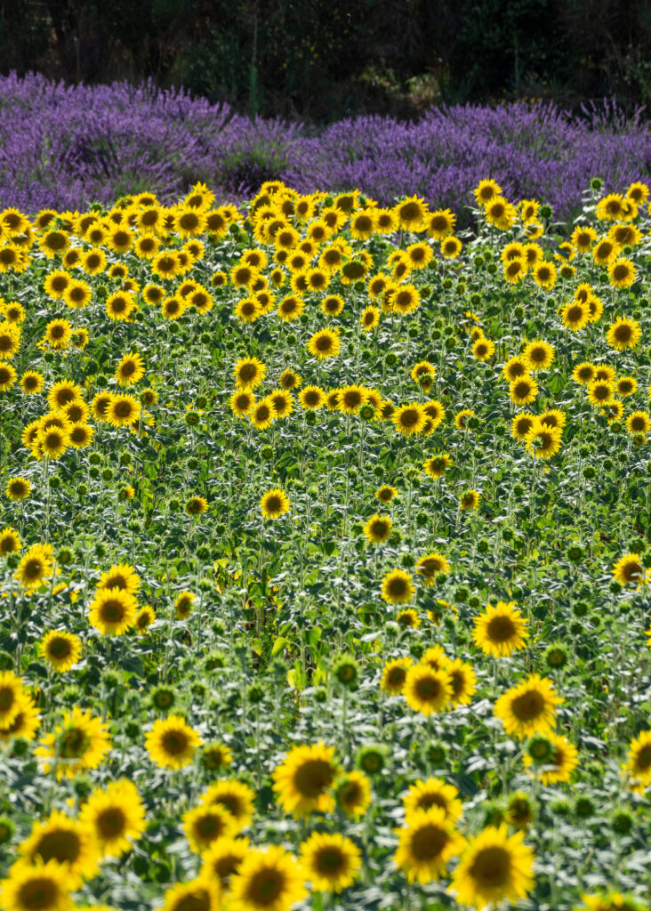 Sunflowers often bloom alongside the region’s lavender fields, with their golden faces in full splendor throughout July and early August. They’re grown primarily for their oil-rich seeds, so unlike the lavender, which gets harvested mid-bloom, the sunflowers get to enjoy a long flowering season before being harvested.