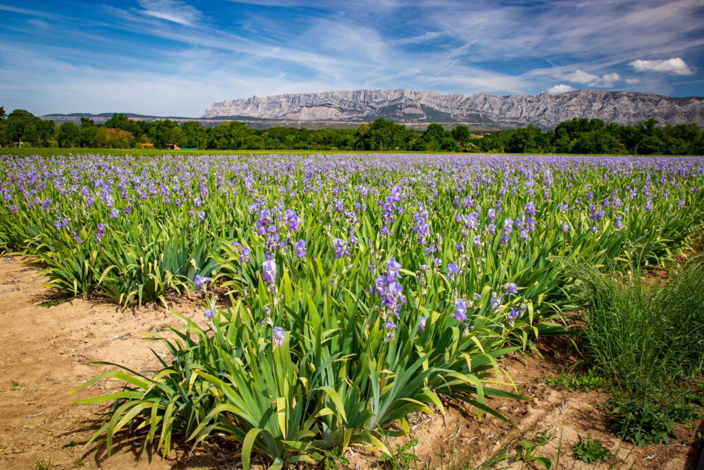 Sown in the shadow of Sainte-Victoire, the Iris farms can be found in the area between the towns of Rousset and Trets in the Bouches-du-Rhône department. Follow the country lanes (not the main highway), such as Chemin du Défend, and keep your eyes peeled.