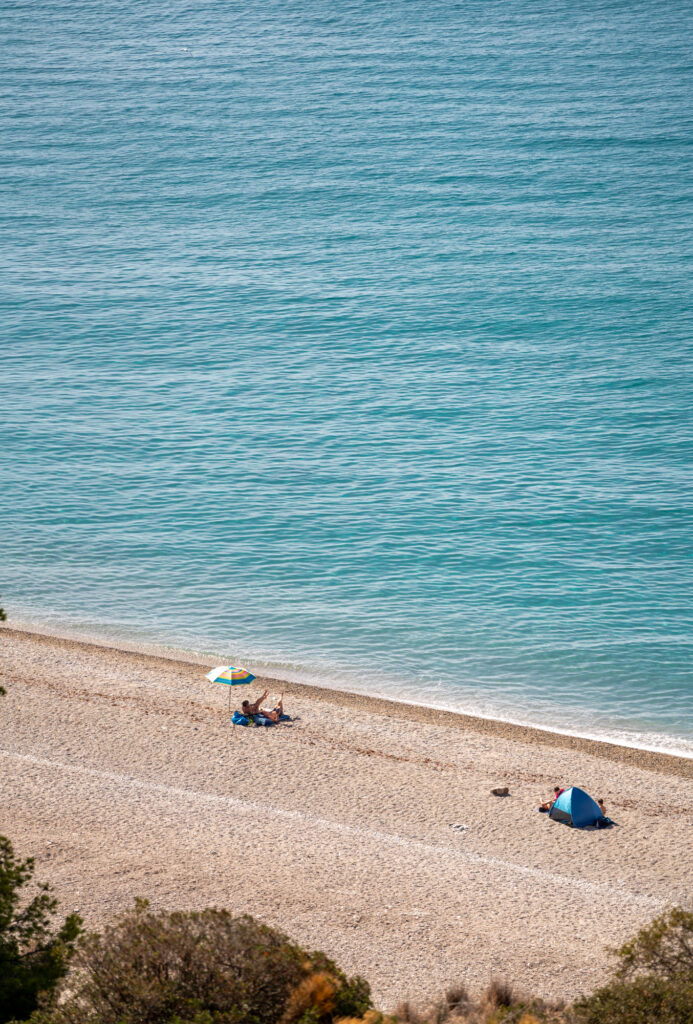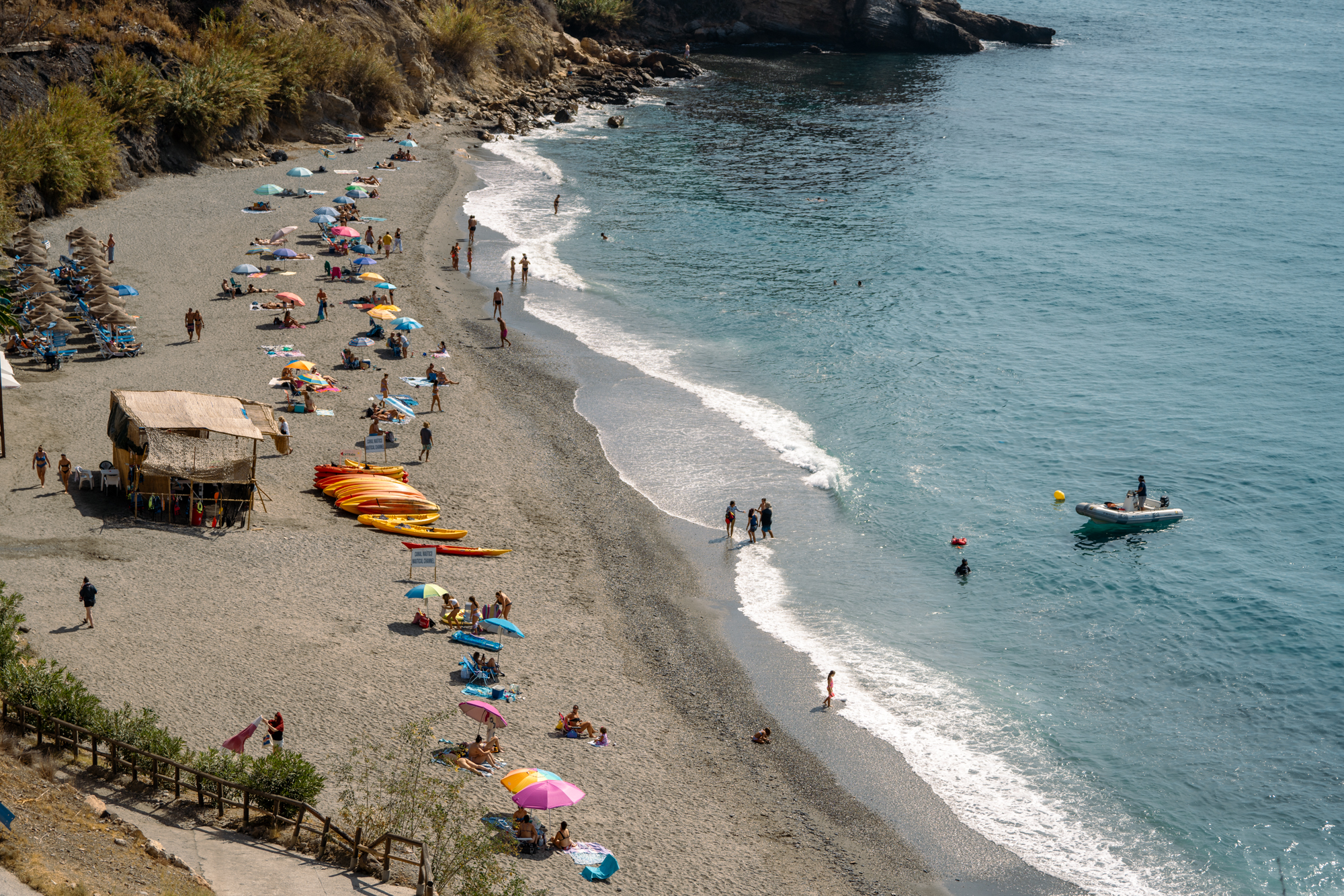 Let’s start east of Malaga at Maro Beach near Nerja. This small beach, hemmed between rocky outlets features an old Moorish tower nearby. You can swim in crystalline waters, sun worship and even enjoy paella overlooking the Mediterranean Sea.