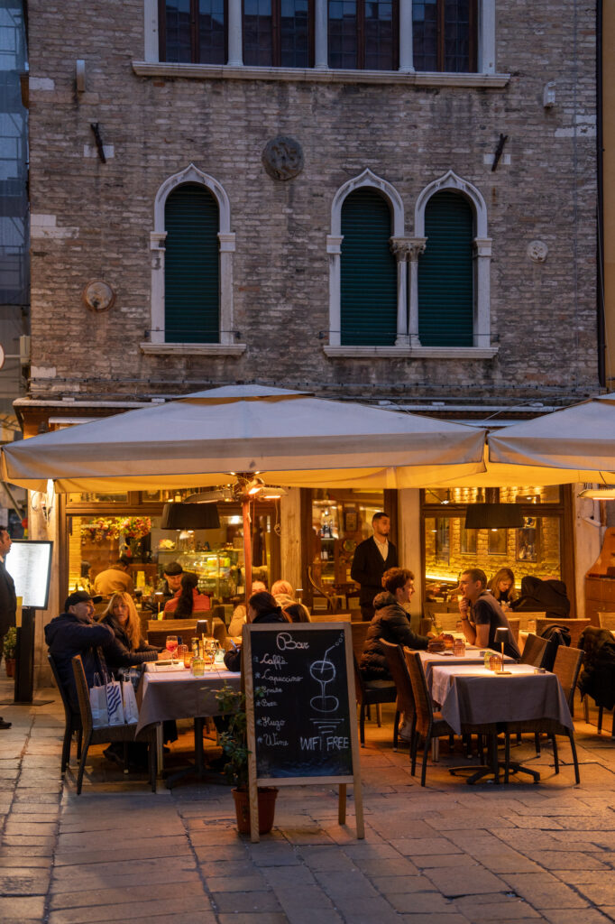 The Venetians gather in groups that spill out to the streets for a glass of wine, a bite to eat, and a chat, and usually visit various bacari during the evening.